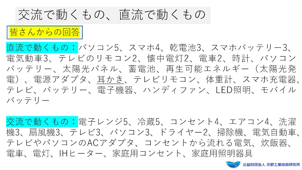 私たちの周りには電気で動作するものがたくさんありますが、これらは交流で動くものと直流で動くものがあります。身近なもので直流で動くもの、交流で動くものを見つけるのが課題でしたが、たくさん答えてくれました。電気機器の中にはより正確に安定して動かすために、交流を直流に替えたり、交流を直流に替えてまた交流に替えて動かしているものもあります。
