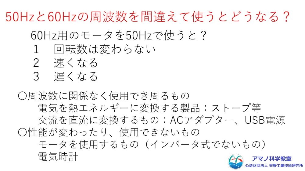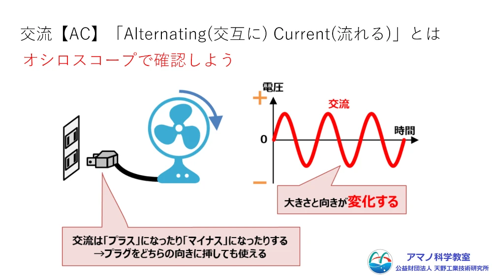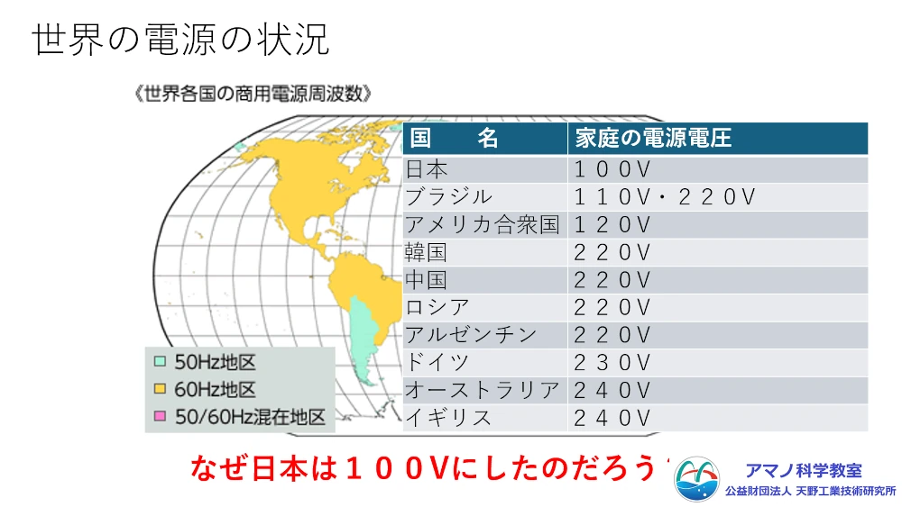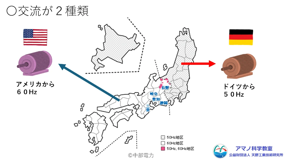 電気は発電所で作られて送電線で家や学校などに送られてきます。発電所から送られてきた電気はプラスマイナスが交互に入れ替わる交流です。日本には交流が2種類あります。富士川を境に東日本は50Hz、西日本は60Hzです。これは最初に導入した発電機がドイツ製の50Hzであったかアメリカ製の60Hzであったかの違いだそうです。