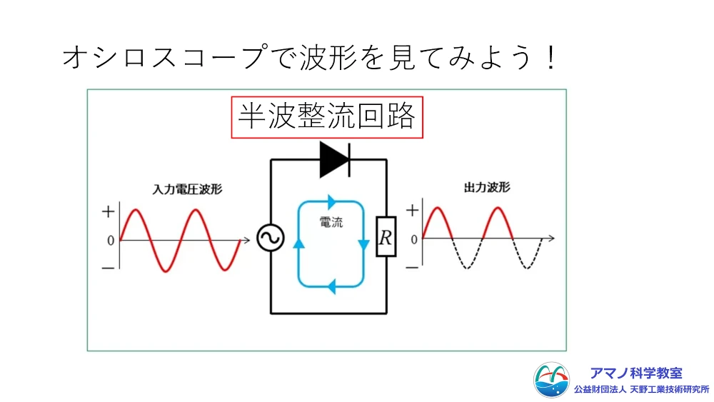 プラスマイナスの向きが交互に変わる交流を、一方向のみにする回路を整流回路といい、ダイオードという電子部品が使われます。例えば、交流の下半分の波をカットすることで反対方向の流れがなくなります。これは半波整流と呼ばれ、電圧ゼロの状態が増え、電気が脈打つように流れるので脈流とも呼ばれます。