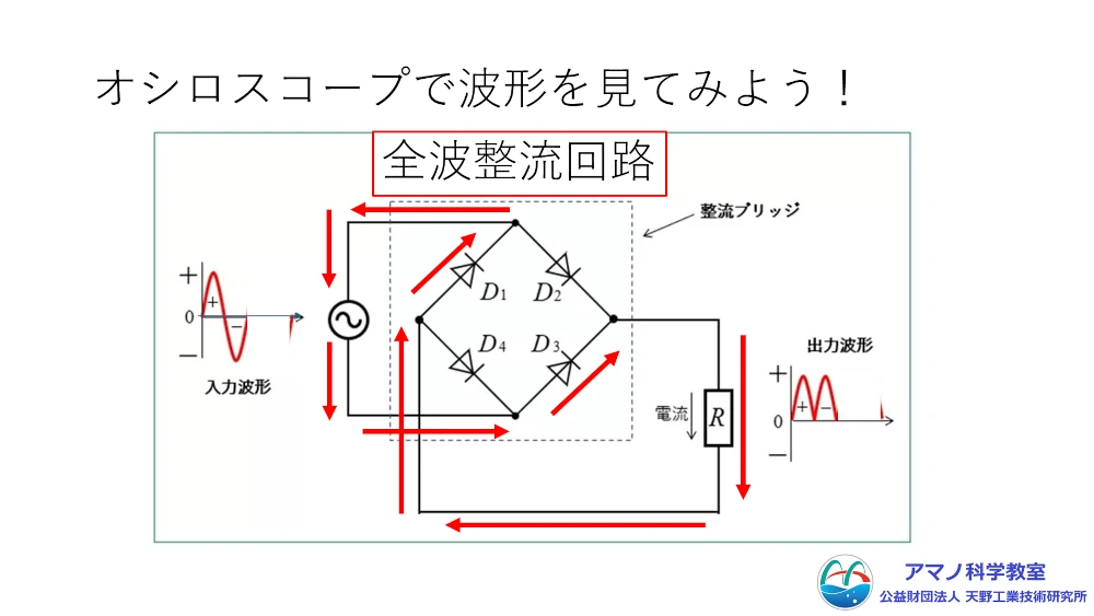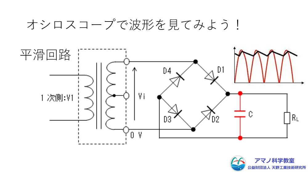 これでは効率的ではないので、ダイオードを4つ組合せ、半波整流でカットしていた電流の向きを変え、効率よく電気を流します。これは全波整流と呼ばれます。それでもジグザグ部分が残るのでコンデンサを使って、コンデンサの蓄電放電により平らにならします。これを平滑回路といいます。