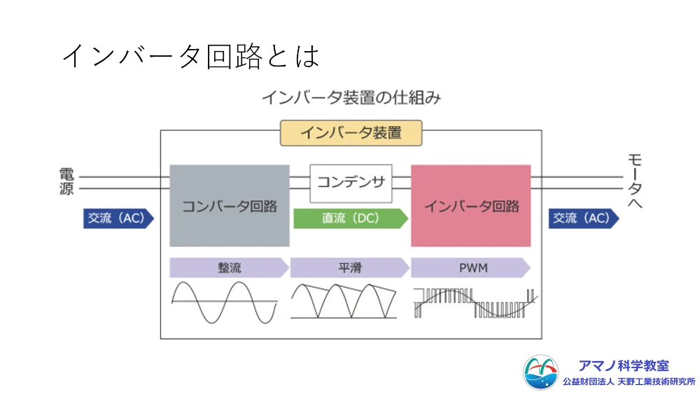 最近の電子機器、電気機器はインバータという回路が使われています。発電所から送られてきた交流を一旦整流して平滑化し、再びこれをスイッチング素子などを用いて交流に変えるもので、エアコンのモータを精密にコントロールし、効率的な運転を行ったり、周波数の影響でちらつく照明もちらつきが抑えられたりします。身近な電化製品にもたくさん使われるようになってきました。
