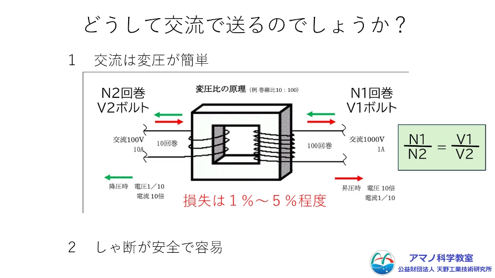 では、なぜ交流で送電しているのでしょうか?それは、交流の方が変圧器を使うと少ない損失で簡単に電圧を変えられること、そして安全に遮断できることです。
