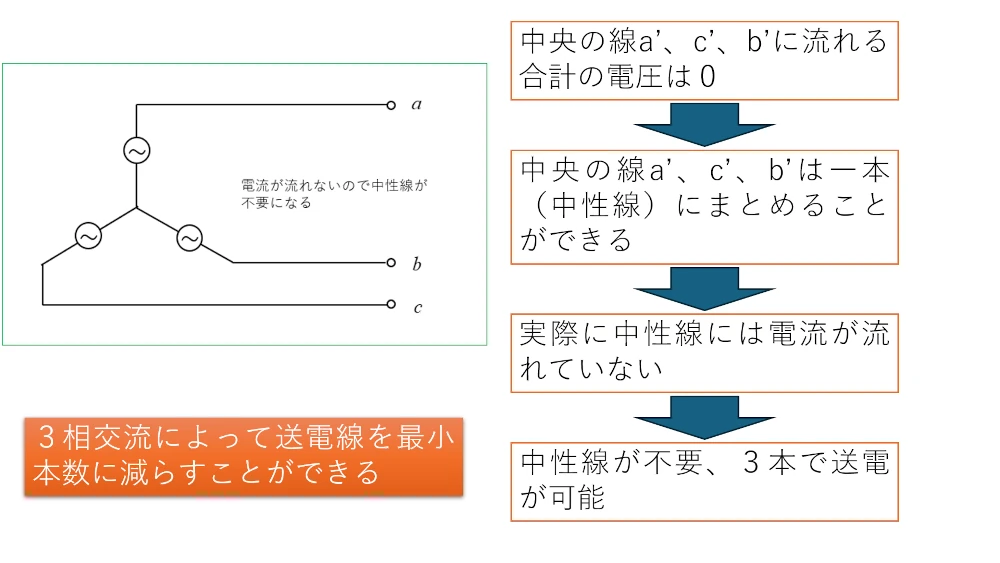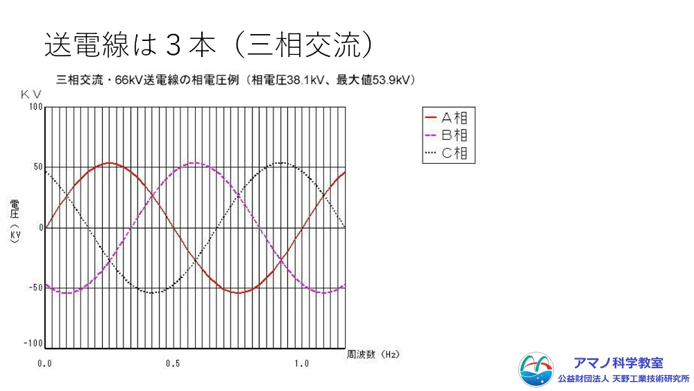 発電所からの送電は、3相交流で送られています。3つの交流が3分の1づつタイミングをずらして送られているため、ゼロになる瞬間がなく、モータなどの電動機を使用する場合、安定した電力を供給できます。