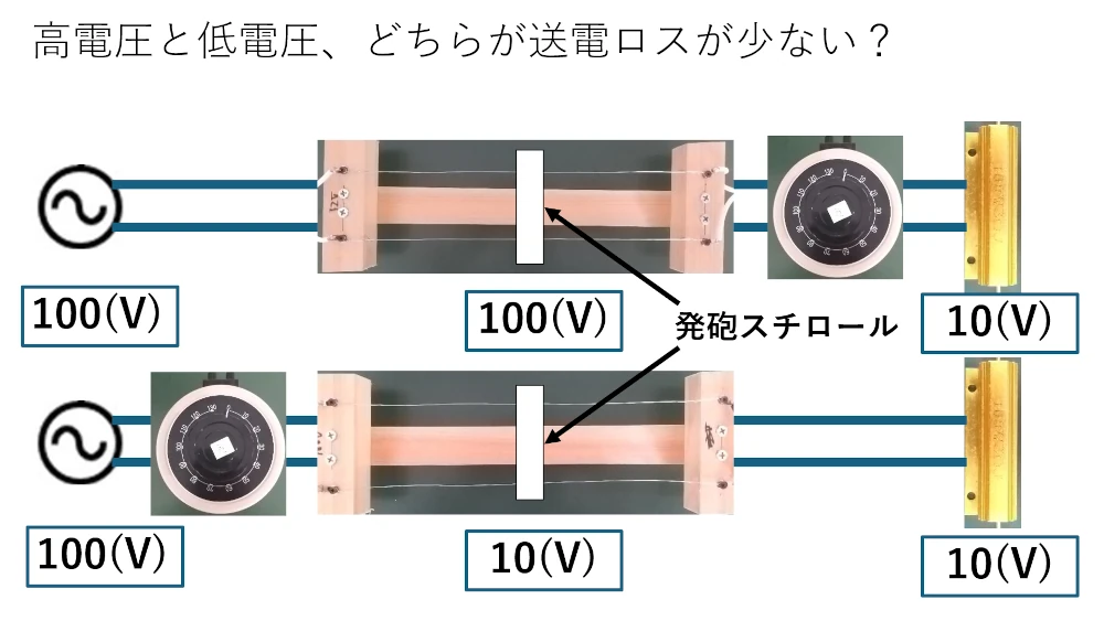 なぜ交流で送電されるのかについて、実験で確かめてみました。家庭用の電源から、スライダックという変圧器を介してニクロム線に電流を流します。一方は100Vそのまま、もう一方は10Vに落として流しました。発熱、つまり損失(ロス)の程度を比べるために、発泡スチロールを置きました。なんと10Vの方が発熱(ロス)が大きく発泡スチロールが溶けてしまいました。できるだけ高電圧で送電した方がロスが少ないことが分かります。