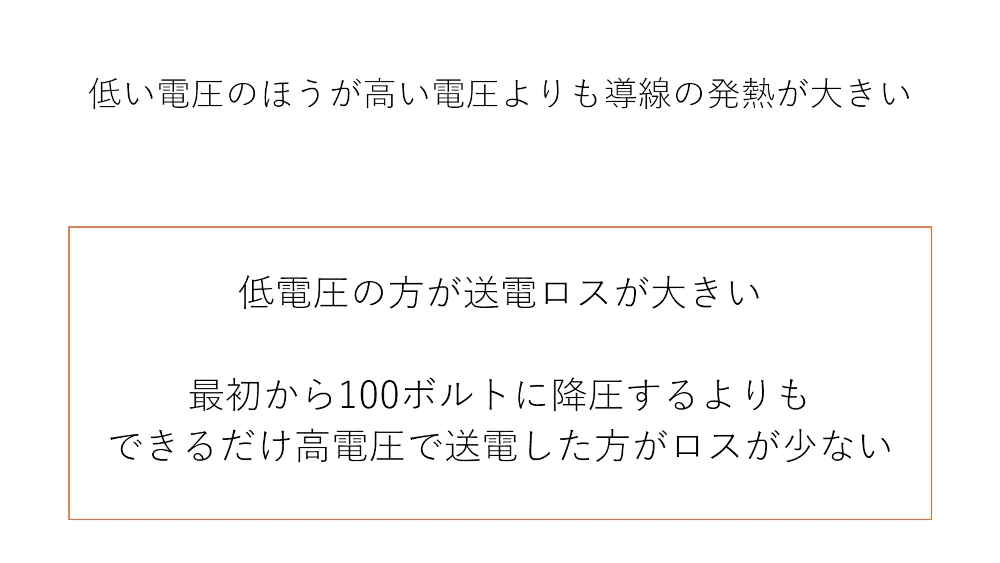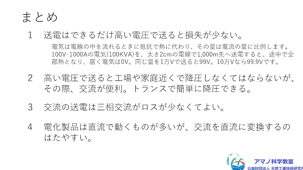 まとめると左のとおりでした。このため発電所からは3相交流で電流を極力小さくしてロスを押さえて送電し、利用する家や学校などの施設の近くで電圧を100Vや200Vなどに変圧していることは理屈にかなった選択です。