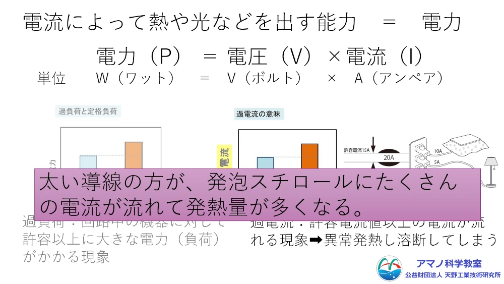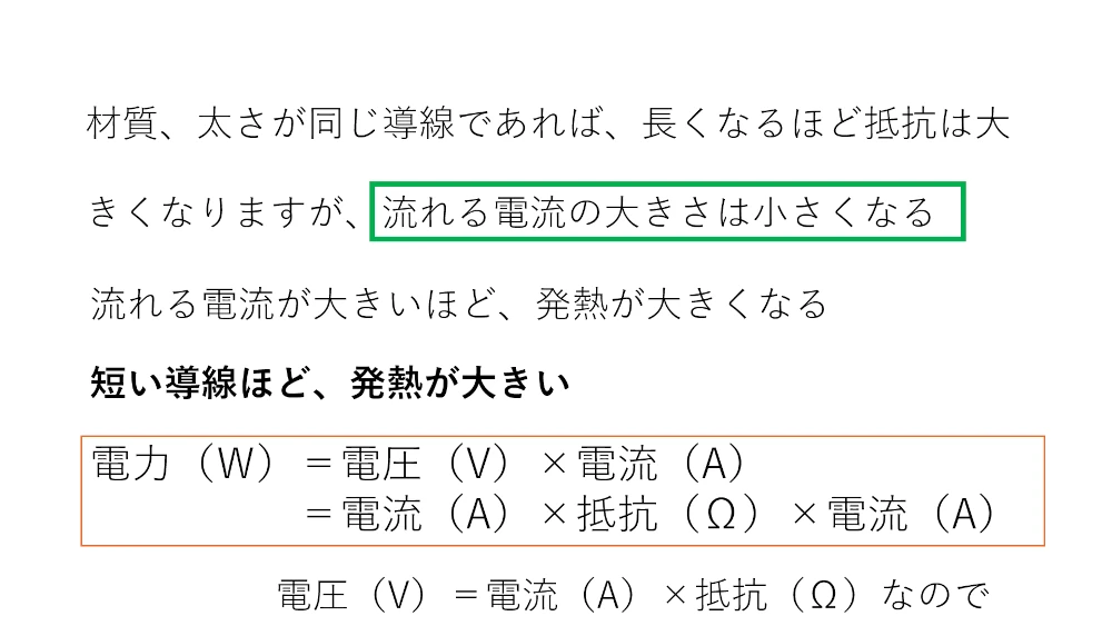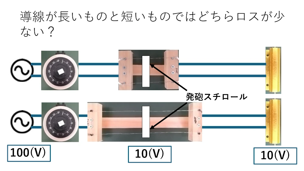長い方のニクロム線の方が抵抗が大きいため電流が小さくなり発熱量は小さく、短い方のニクロム線の方が抵抗が小さいため電流が大きくなり発熱量が大きく発泡スチロールが早く溶けました。流す電流を少なくすることが損失を押さえるカギになります。