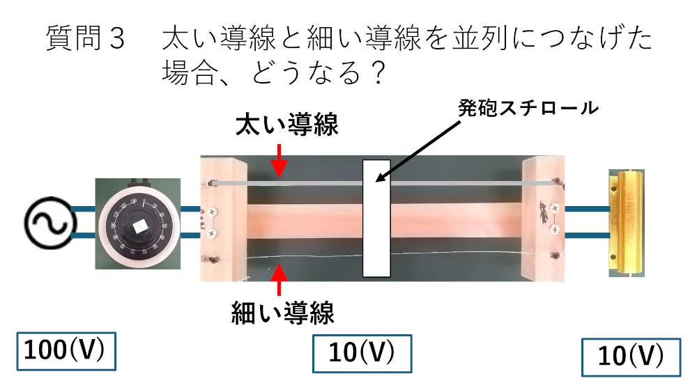さらに送電線の太さと損失(ロス)の違いを確かめました。同じ10Vですが太いニクロム線に乗せた発泡スチロールの方が早く溶けました。送電線は太いと多くの電流が流れ損失が大きくなります。