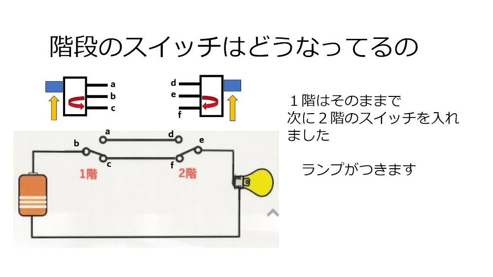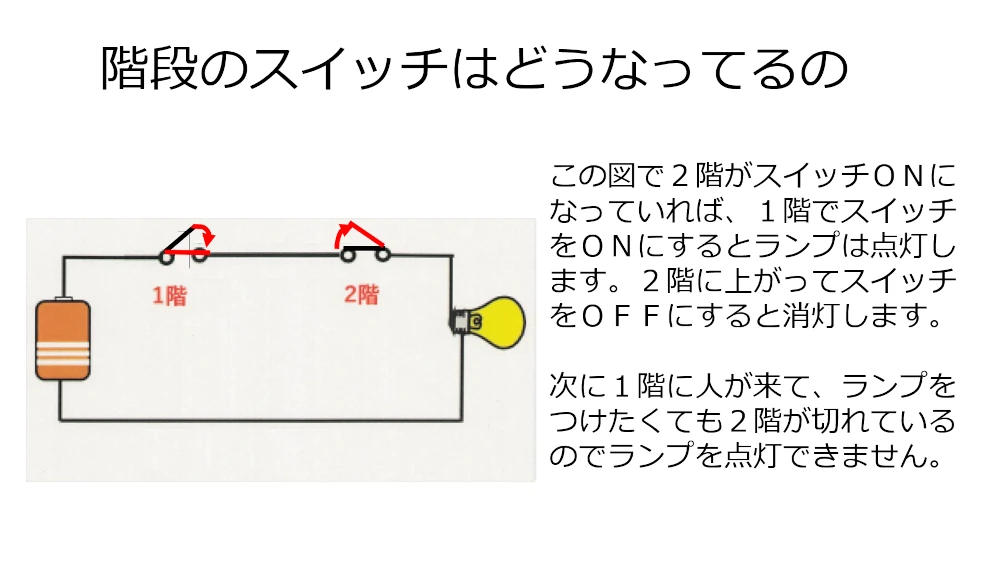 実際に電気を使う場面では、電源にスイッチやランプ、電子機器類を接続します。電気が通り抜けて、元の場所に戻ってくるまでの一巡りの道がループ状に作られているので回路と呼びます。簡単な回路を実際に作ってみました。例えば、階段の上と下で、階段の照明を点灯・消灯させる回路を考えてみました。単純に1階と2階にそれぞれ照明をon-offするスイッチを取り付けただけでは1階でスイッチを切ってしまうと、もう一度1階に行かないと照明をつけることが出来ません。でも実際には1階でも点灯・消灯できるし、2階でも点灯消灯できます。