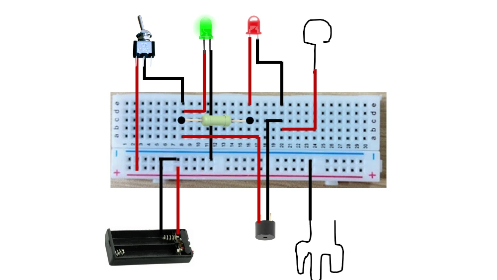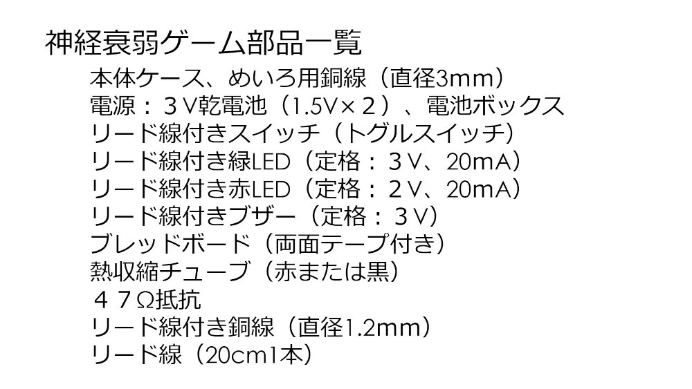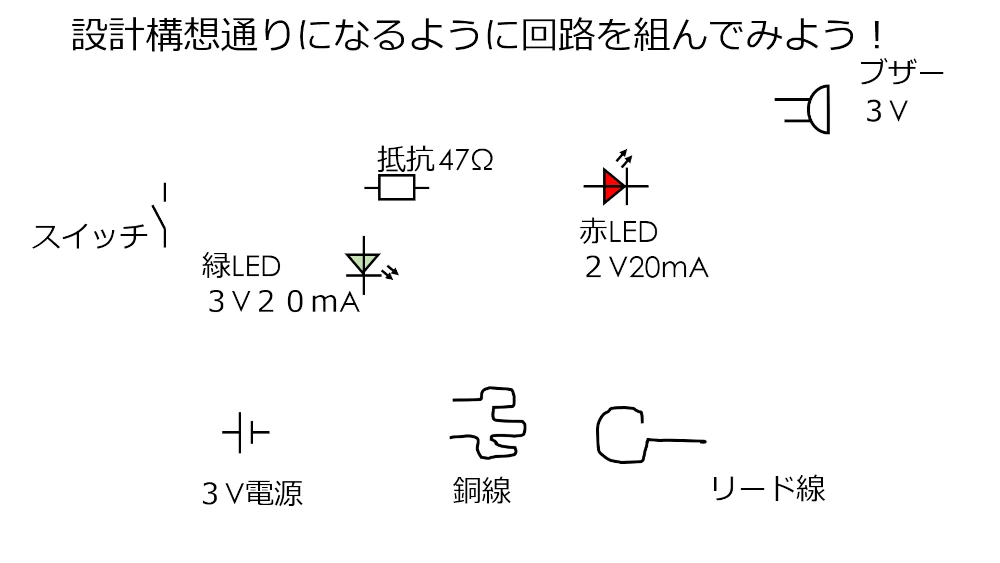 回路図を見ながら、ブレッドボード上に電子回路を作ります。必要な部品は部品一覧のとおりでした。スイッチ、抵抗、2色のLED、ブザー、電源(電池ボックス)、そして迷路の銅線とその迷路に沿って動かすリード線です。