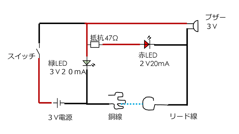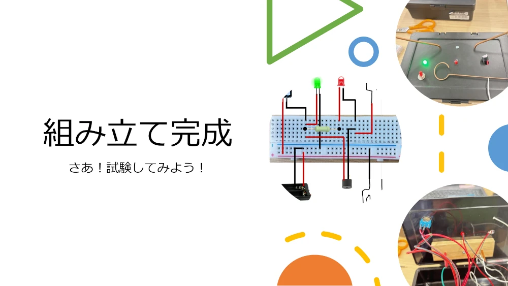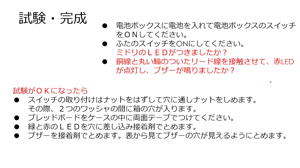 回路が出来たら、回路を筐体に収めてしまう前にちゃんと回路ができているか試験しました。電池ボックスを接続し、迷路とリード線が接触すると赤色LEDが点灯しブザーが鳴るかどうか確かめます。