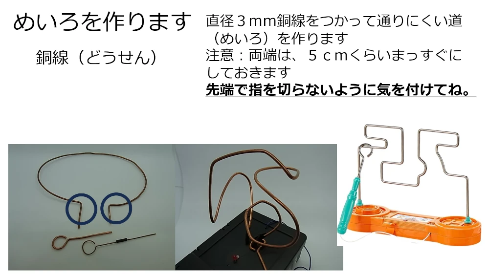 ここまで学習してきた電子回路の応用として神経衰弱ゲームの製作に挑戦しました。テレビで見る「いらいら棒」です。迷路状に曲げた銅線をたどって先端をループにした銅線を、接触しないようにスタートからゴールまで動かします。途中で銅線が接触するとスイッチが入ってブザーが鳴り、赤色のLEDが点灯するというものです。迷路状に曲げた銅線を複雑にするほど難易度は上がります。