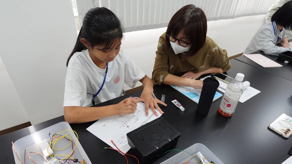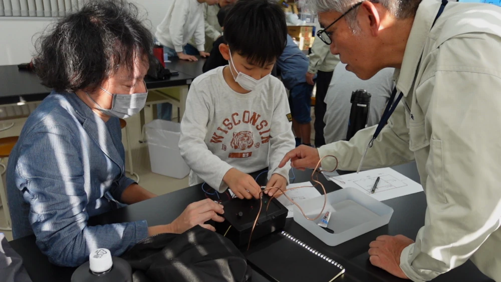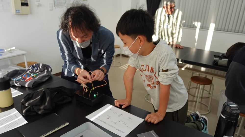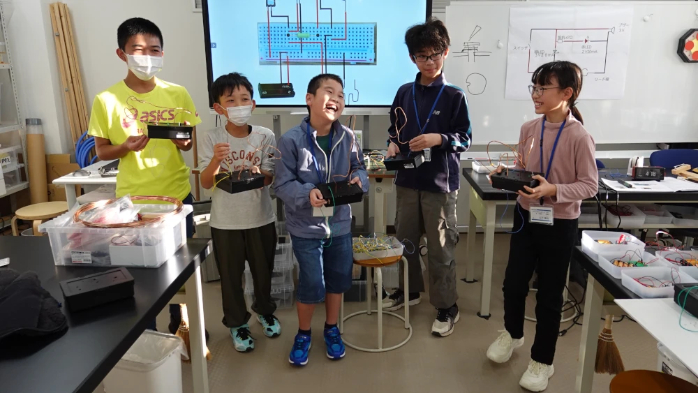 さあ完成したらゲーム開始です。スピードを競います。うまくできたら、迷路を段々むづかしくしていきます。みんな歓声を上げながら夢中になって挑戦しました。スイッチ、抵抗、LED、ブザー、電池と銅線、こんな簡単な回路でこういうゲーム回路も作れます。他にどんなことにお応用できるかな?色々なアイデアが出されました。防犯用に窓が空いたら鳴る回路に使えるとか...