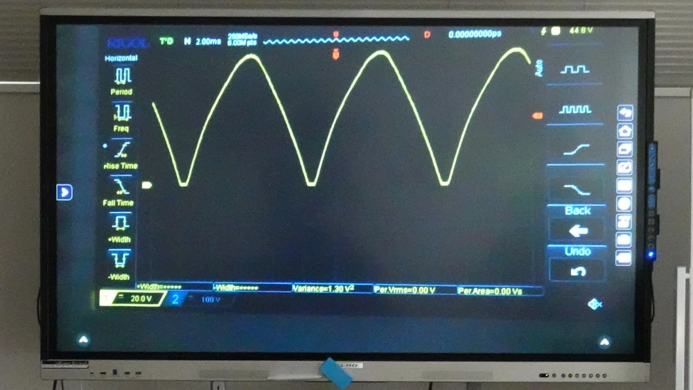 交流の電圧は上の図のように徐々に電圧が上がり最大値まで行くと下がり、プラスマイナスが入れ替わって徐々に(マイナス方向に)電圧が上がるとまた徐々に下がり、ということを繰り返しています。瞬間的には電圧がゼロになるときがあります。オシロスコープをとおすとこの波形が見られます。