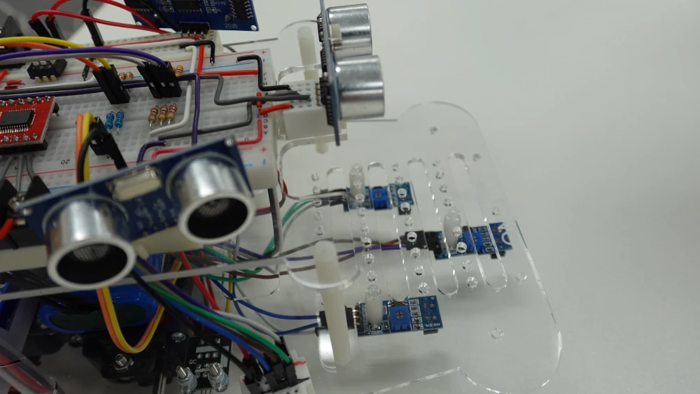 いよいよフロント、右側面、左側面、3つの超音波センサを使って壁に囲まれたクランクを自動走行させます。3つのセンサがどのような検知を行うか場合分けと、その時の処理をプログラムに書き込んでいきます。このHC-SR04という超音波センサモジュールは正面から±7.5°程度の範囲では反射波を正確に受信できますが、少しずれると測定不可能になってしまうという特性があります。このため壁に対して斜めに侵入する場合は、壁に当たるくらい近づかないとわからないということになります。そこで左右のセンサは少し斜め(約15度)に取り付け、真横だけでなく「前斜め方向」までカバーでき、角のある通路や曲がり角に早く気づき、死角が減るようにしました。特に壁に対して斜めに侵入すると、進行方向と同じ向きに取り付けた場合、制御不能に陥りやすくなります。