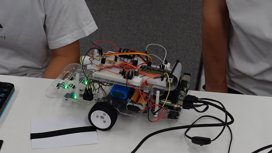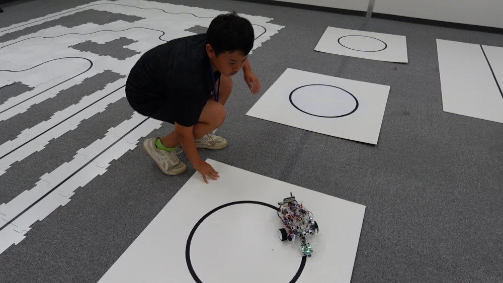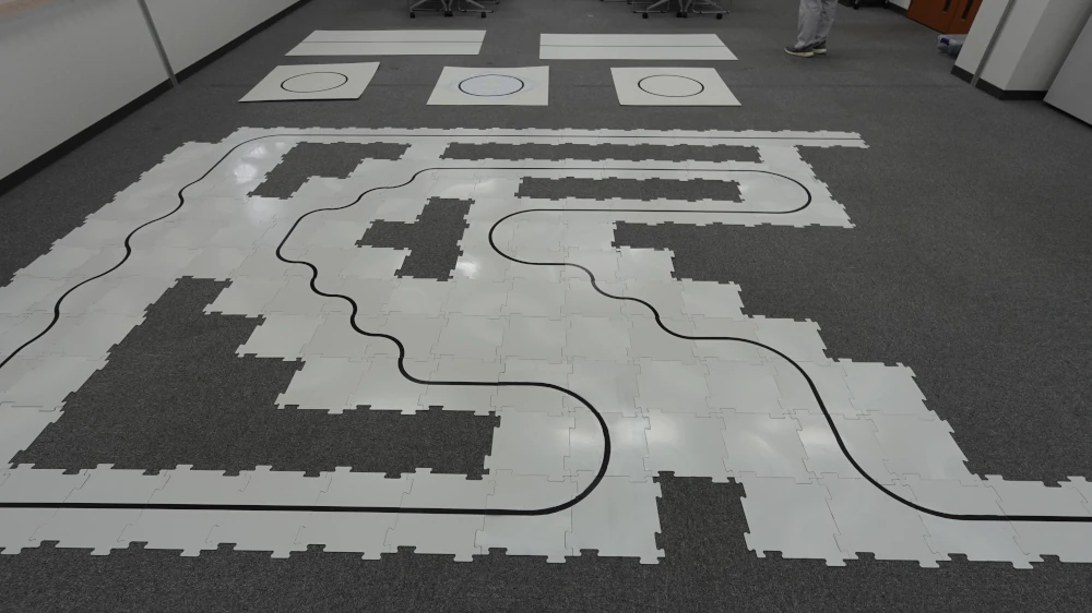実際にコースを走らせてみました。ジグザグ走行をしたり、コースを外れたり、実際に走らせるとなかなかうまくいきませんが、その都度調整していくと次第にきれいに走行するようになりました。まだまだプログラムの工夫が必要ですが、完成に大きく近づきました。