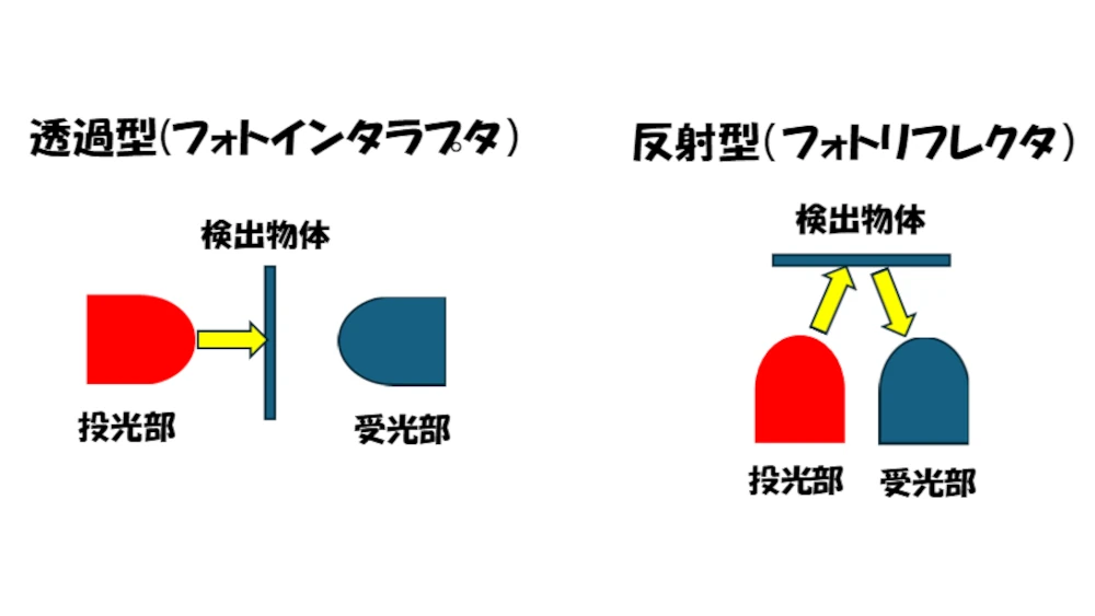 通り抜けてきた光を検出するのか、反射してきた光を検出するのかの違いで、光を発する部分が光を検知するセンサと分離されているか一体となっているかなどの違いがあります。今回は外部から入ってくる光の影響を避けるため赤外線フォトセンサを使いますが、色を判別する場合などは可視光を利用します。