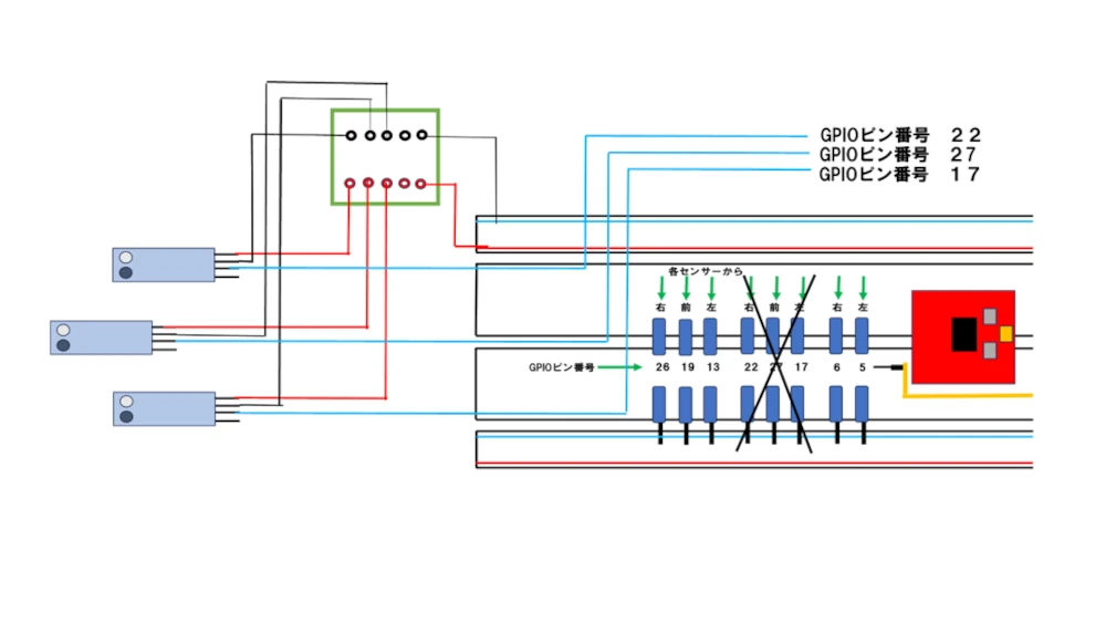 TCRT5000センサを5V電源とし、センサ出力を分圧してGPIOピンに入力する予定でしたが、3.3V電源でも対応できることと、使用電流も50mA以内に収まると考えられるので、5V電源は使用しないこととしました。センサモジュールは次の手順で取り付け、調整を行いました。