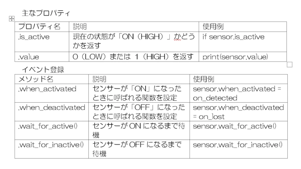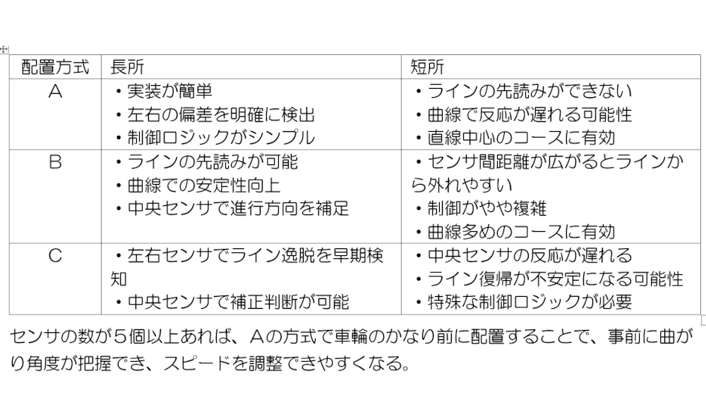 センサ配置の違いによる長所短所は表のとおりです。センサの数を増やして、Aの方式で車輪のかなり前に配置すれば、事前に曲がり角度が把握できて、スピードも調整しやすくなりますが、センサ3つでも、on・offで制御するのではなく、アナログ的に受光量を確認して制御する場合はA方式で問題はないと考えられます。5連のセンサユニットも販売されていて、これを使用したロボットカーも製作されていますが、今回は3つのセンサを、ラインの先取りのしやすさを考慮してB方式である中央センサを前に出す配置で行いました。いろいろな方法があるのでいろいろ確かめてどの方式がよいか考えることが大切です。