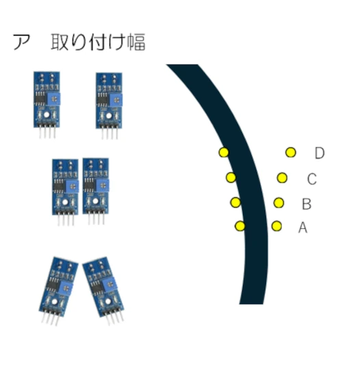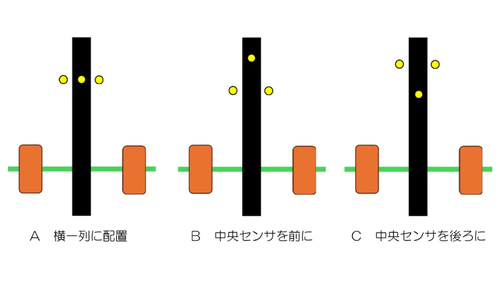 ・Aのようにセンサ間隔を狭くした場合、ラインからはずれにくいけれど、センサのon・offがはげしく、その分、速度が遅くなります。