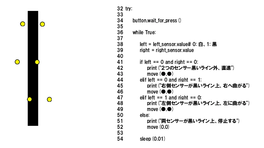 中央のセンサをどの程度前に出したらよいかは、ロボットの性能や速度によって変わります。スピードを速くすると、その分、惰性で動く量も多いため、曲がり切れずにラインを外れてしまうので、プログラムでは、中央のセンサが黒いラインからはずれたら、スピードを落とし、曲がりやすくする工夫をしました。