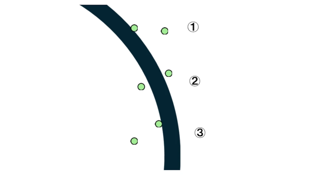 ①の状態:右側センサはライン外。左側センサが直前まではライン内にある。