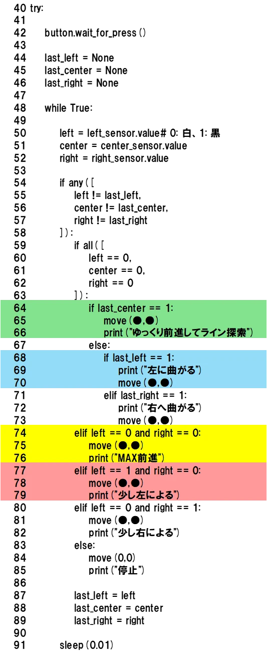 53行目~56行目:これはif left != last_left or right != ast_right:と同じ意味です。つまり、left か right のどちらかが変化があれば、このif文を実行しますが、センサの値に変わりがなければif文を実行せずに73行目に進み、46行目に戻って、繰り返し実行します。同じ動作であれば、変化するまでその動作を繰り返し、変化があれば、if文の中身を実行します。