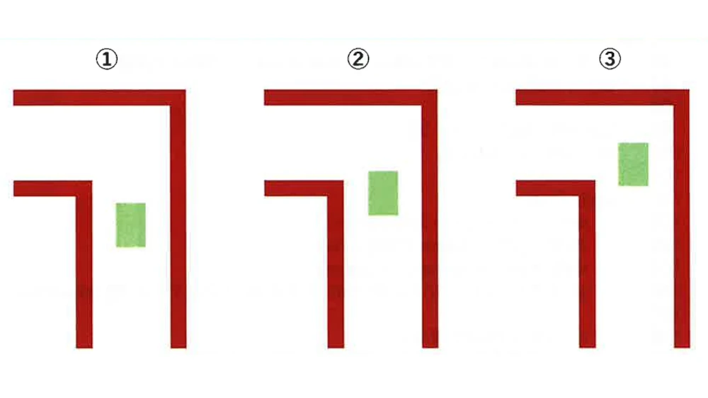 第11回の「クランク走行の基本」で考えたプログラムは左右の壁との距離を均等に保ちながらコーナーまで進みターンするものでしたが、コーナーをいかにうまく曲がるかということについては不十分なものでした。上の図の②から③までの移動についてプログラム上では指示していませんでした。そこで、両側の壁を意識して走るのではなく、片側のみを考えて走るようします。